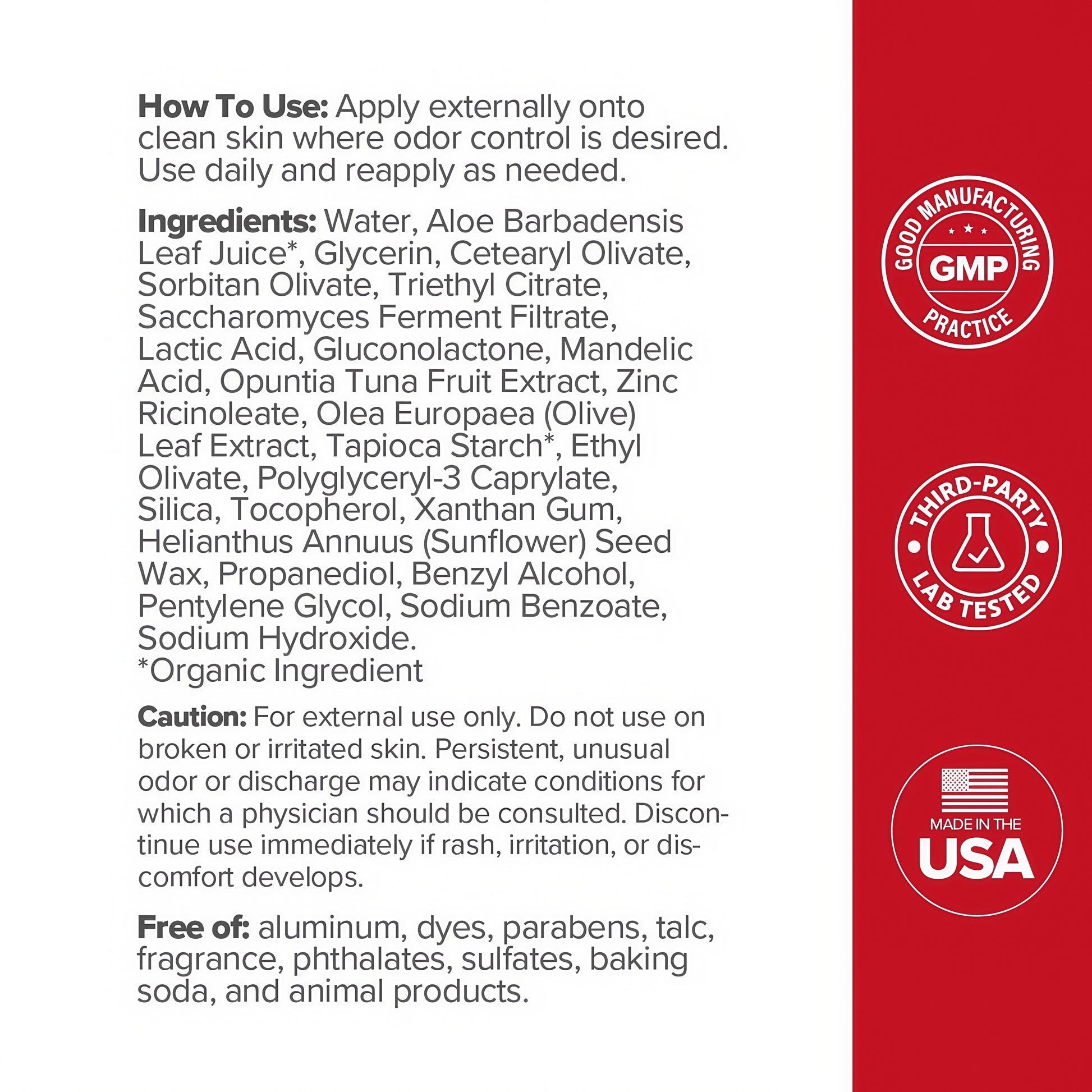 Lactic acid & mandelic acid gently penetrate different layers of the skin and acidify its pH, making it less hospitable to odor-causing bacteria. Probiotic ferment(a special type of fermented sugar cane) and zinc ricinoleate cling onto odor-causing compounds and absorb odor.